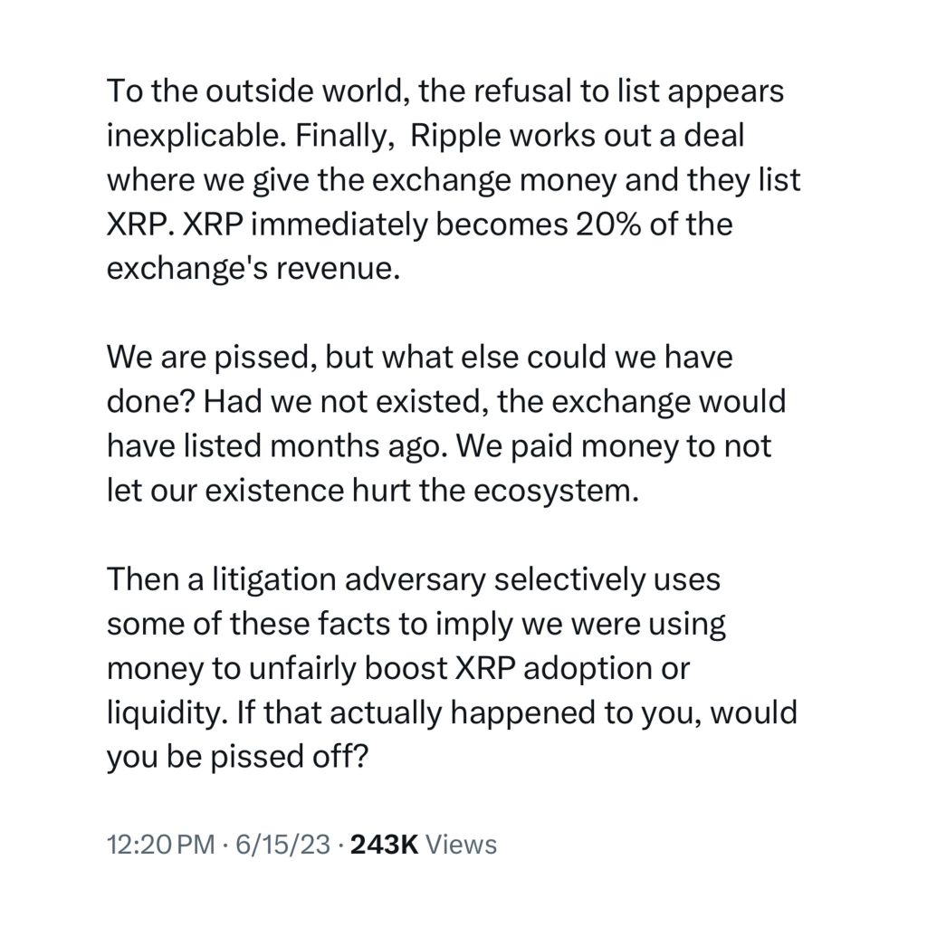 Once XRP was listed, it reportedly accounted for about 20% of the exchange’s total revenue. This outcome brought out the trading demand for the asset. Schwartz stated that Ripple viewed the payment as necessary to avoid limiting market access.